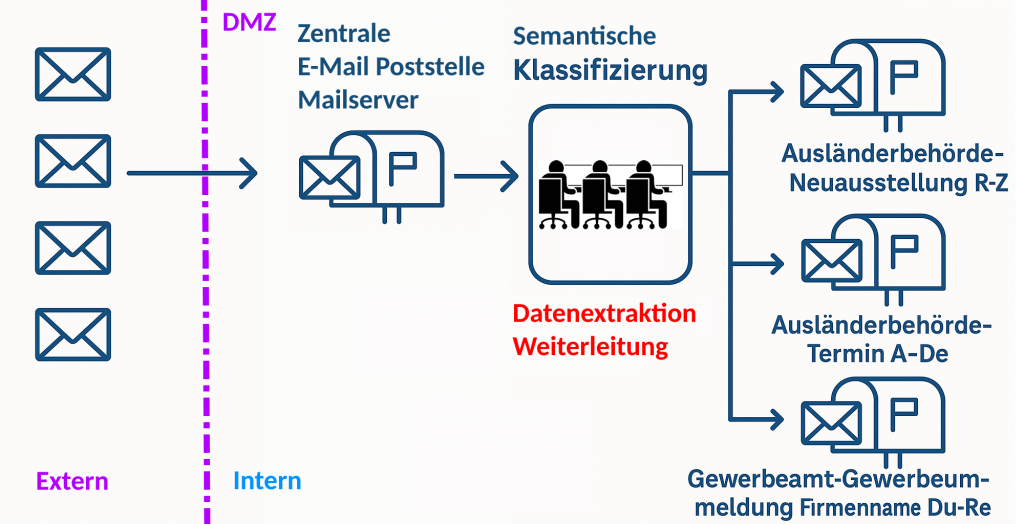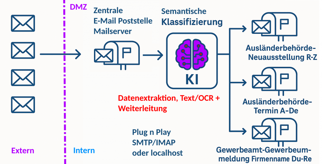 Automatisierte Erfassung, semantische Klassifikation und Weiterleitung eingehender Anfragen per E-Mail – schnell, sicher & DSGVO-konform lokal auf eigener Hardware.